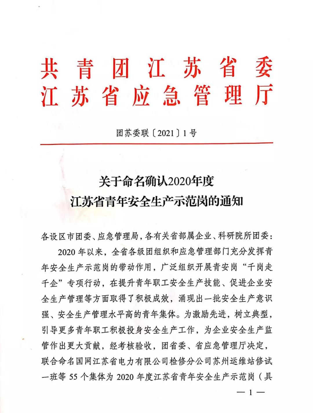 近日,共青团江苏省委、江苏省应急管理厅公布了获得“2020年度江苏省青年安全生产示范岗”荣誉称号的集体名单,开云最新官方工务事业部动力科获评“2020年度江苏省青年安全生产示范岗”。