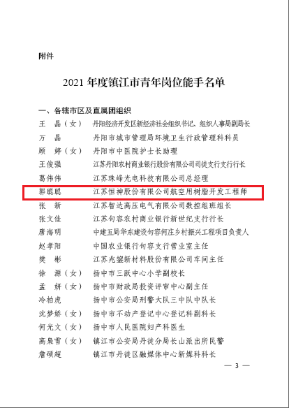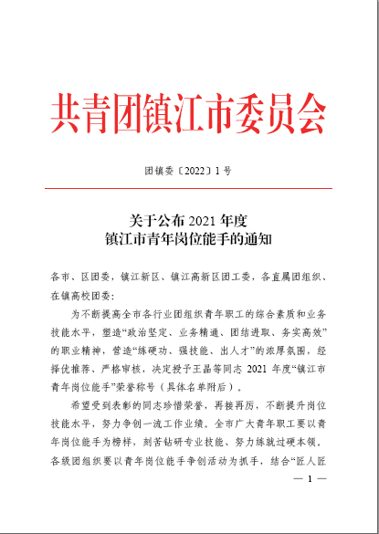 为不断提高全市各行业团组织青年职工的综合素质和业务技能水平,塑造“政治坚定、业务精通、团结进取、务实高效”的职业精神,营造“练硬功、强技能、出人才”的浓厚氛围,经择优推荐、严格审核,开云最新官方股份研发工程师郭聪聪荣获“2021年度镇江市青年岗位能手”称号。